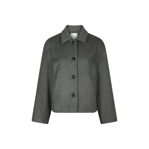 Trendy uldjakke i et moderne, boxy snit. Jakken har et afslappet look med frontlommer, skjortekrave og knaplukning hele vejen op. Designet med sænkede skuldre for et casual og stilrent udtryk – perfekt til både hverdag og overgangssæsoner.