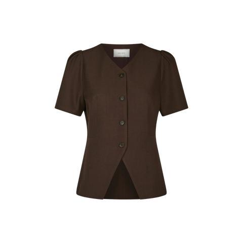 Denne structure blouse kombinerer en elegant pasform med et moderne design. Den korte ærmelængde gør den velegnet til både hverdag og mere formelle lejligheder. Materialerne, der består af en blanding af polyester og elastan, sikrer både komfort og bevægelsesfrihed, mens den mørkebrune farve giver et tidløst udtryk.