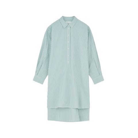 Edda shirtdress i White/Aqua Stripe fra Skall Studio er en klassisk skjortekjole med et tidløst, skandinavisk udtryk, der gør den til et perfekt valg til din garderobe. Denne lette kjole er lavet i 100 % økologisk bomuld med GOTS-certificering og har en afslappet, oversize pasform, der falder smukt omkring kroppen med naturlig bevægelse og komfort. Kjolen er detaljeret med en skjortekrave og lukkes halvvejs ned foran med perlemorsknapper, der giver et elegant og diskret look, mens de praktiske slidser i siderne tilfører et moderne touch og ekstra bevægelsesfrihed. Den hvide bund med aqua-striber skaber et lyst og friskt udtryk, som gør Edda shirtdress ideel til både varme forårs- og sommerdage – bær den alene med sandaler til hverdag eller sæt den sammen med en let strik og sneakers for en afslappet weekendstil. Edda shirtdress er både et smukt og funktionelt stykke design, som kombinerer kvalitetens naturlige følelse med Skall Studios karakteristiske minimalistiske æstetik.