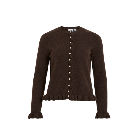 En let og alsidig cardigan med rund halsudskæring og lange ærmer, der giver et klassisk og feminint udtryk. Cardiganen har knaplukning foran og fine flæsedetaljer, der tilfører et elegant og dekorativt touch til det enkle design.