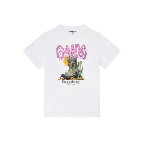Opgrader din basisgarderobe med denne ikoniske GANNI-t-shirt i ren hvid, hvor klassisk enkelthed møder cool, moderne attitude. T-shirten er lavet af 100 % økologisk bomuld for en blød og behagelig følelse hele dagen, og den har en afslappet, almindelig pasform med rund hals og korte ærmer, som gør den til det perfekte hverdags-item, du kommer til at bruge igen og igen. Det iøjnefaldende cowboystøvle-print tilføjer et autentisk vestligt twist, der skiller sig ud fra mængden, samtidig med at den lille tekst “Have a nice day! Please recycle!” giver et legefuldt og bæredygtigt statement. T-shirten er produceret i Portugal med fokus på kvalitet og finish, så du både får stil og komfort i ét. Style den med denim og sneakers for et cool hverdagslook eller med en nederdel og støvler for et mere fashion-orienteret outfit.