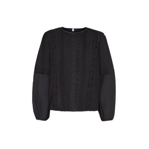 Bluse mit Spitzendetails, Falten an den Seiten und an den Ärmeln. Die Bluse hat unten Spitzenbesatz und Gummizug in beiden Ballonärmeln. Tiefer Ausschnitt am Hals, der mit einem Knopf geschlossen wird.