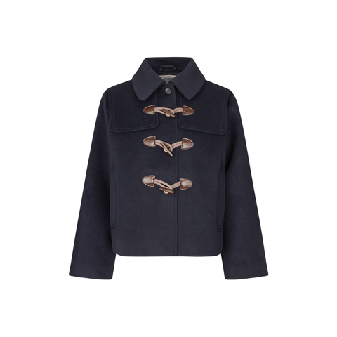 Denne Banielle-jakke er en moderne og elegant version af klassisk duffelcoat i en varm uldblanding. Den har en løs pasform, toggle-lukning foran og en knap ved halsen, der giver mulighed for en hyggelig krave, mens sidelommerne tilføjer praktisk funktion. Jakken kombinerer komfort og stil — perfekt som ydre lag over både hverdagens jeans og en mere elegant kjole. Med sin dybe, blå farve og tidløse snit giver den et sofistikeret og stilrent look, du kan bruge sæson efter sæson.
