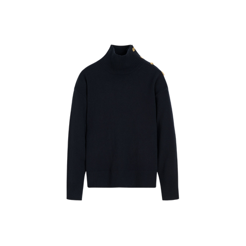 Es ist aus weicher, warmer Wolle gestrickt und hat eine geknöpfte Schulterpartie, die mit grafischen Knöpfen verziert ist, die einen modernen und unverwechselbaren Look verleihen.