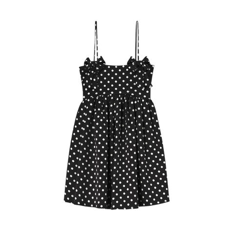 Dieses kurze Satinkleid von GANNI vereint klassisches Pünktchenmuster mit einem modernen, femininen Look. Der leicht glänzende Satin fällt elegant, während die verstellbaren Träger, die Schleife vorne und der elastische Rücken für eine bequeme und schmeichelhafte Passform sorgen. Das Kleid ist perfekt für Partys und Abendveranstaltungen, bei denen Sie einen verspielten und gleichzeitig eleganten Look wünschen. Kombinieren Sie es mit High Heels für einen eleganten Auftritt oder mit einem Blazer und Stiefeln für einen lässigeren, moderneren Stil.