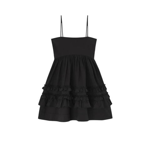Elegantes schwarzes Kleid von Ganni mit femininer und zugleich ausdrucksstarker Silhouette. Das figurbetonte Oberteil schmeichelt der Figur, während der voluminöse Rock mit sanften Rüschen für Schwung und einen luftigen Fall sorgt. Schmale Träger und das schlichte Oberteil verleihen dem Kleid einen modernen, minimalistischen Look und machen es vielseitig kombinierbar – sowohl lässig im Alltag mit flachen Schuhen als auch elegant zu festlichen Anlässen mit High Heels. Ein zeitloses Ganni-Kleid, das Saison für Saison Freude bereitet.