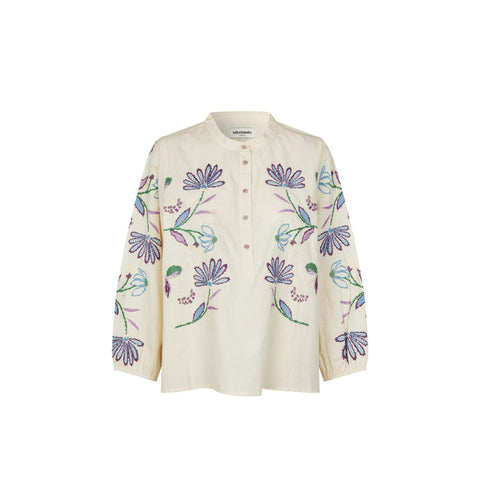 Diese elegante, cremefarbene Bluse besticht durch feine Stickereien, die ihr eine feminine und raffinierte Note verleihen. Sie bietet eine bequeme Passform und ist aus leichtem Material gefertigt, das den ganzen Tag für angenehmen Tragekomfort sorgt. Dank ihres zeitlosen Designs lässt sie sich sowohl im Alltag als auch zu formelleren Anlässen vielseitig kombinieren. Ob zu Jeans, Röcken oder klassischen Hosen – sie ist die perfekte Ergänzung für einen stilvollen und abwechslungsreichen Look.