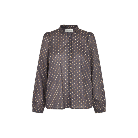 Das Hemd besticht durch eine feine Rüsche am Kragen und kleine Falten an der Schulter, die ihm eine feminine und elegante Note verleihen. Es hat eine klassische Knopfleiste vorne, lange Ärmel mit Manschetten und Knopf sowie einen geraden Schnitt, der es sowohl bequem als auch modisch macht.