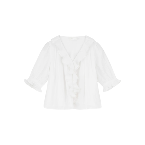 Skall Studio Clea Blouse er en feminin bluse med V-hals og fine flæsedetaljer, der giver et let og romantisk udtryk. De halvlange pufærmer med knap og flæse samt læg foran og bagtil skaber smuk vidde og en elegant, luftig silhuet. Fremstillet i 100% økologisk bomuld og GOTS-certificeret for en mere ansvarlig produktion. En tidløs og bæredygtig bluse, der passer perfekt til både hverdagsbrug og mere feminine looks.