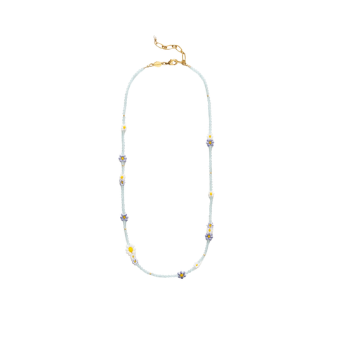 Halskæden er fremstillet i messing med 18 karat guldbelægning og en beskyttende e-coating, der modvirker anløbning. Den er detaljeret med glasperler, akvamarin og porcelæn, hvilket giver et let og elegant udtryk. Kæden kan justeres fra 40,5 til 45 cm og afsluttes med en hummerlås og en fin detalje i form af en dyrket ferskvandsperle.