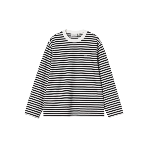 Women’s L/S Ezra T-Shirt er fremstillet i en blød, mellemtyk bomuldsjersey med striber og designet i en løs pasform. De lange ærmer og det afslappede snit giver et ubesværet hverdagslook, mens grafisk broderi på brystet tilfører et karakterfuldt og eksklusivt touch. En komfortabel og stilren langærmet T-shirt, perfekt til både jeans og casual layering.