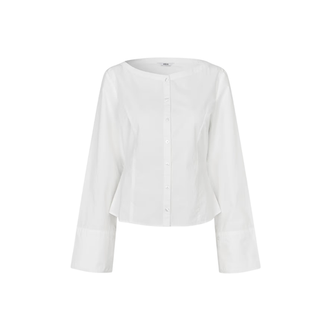 Langærmet skjorte med normal pasform og bådudskæring. Gennemgående knaplukning foran og brede manchetter. Hovedmateriale fremstillet af bomuld.