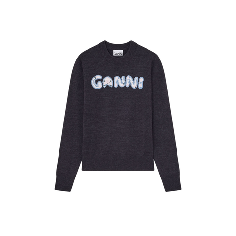 Eksklusiv GANNI sweater i farven Phantom (gråsort), designet i blød og glatstrikket kvalitet. Sweateren har klassiske ribkanter ved hals, ærmer og bund, som sikrer en flot pasform og komfort hele dagen. Foran prydes den af hæklede bogstaver i hvid og lyseblå med fine lyserøde blomster, der tilsammen danner det ikoniske “GANNI” logo – et feminint og unikt statement-look. Strikken er fremstillet hovedsageligt i blød uld med indslag af bomuld, hvilket giver en varm, åndbar og behagelig sweater perfekt til både hverdag og sæsonens køligere dage.