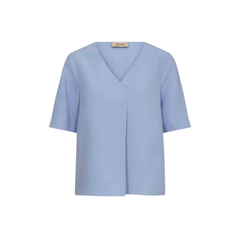 Lys blå bluse med korte ærmer i et let og behageligt tekstil af lyocell med hør. Blusen har et klassisk snit med feminin V-halsudskæring og en elegant lodret foldedetalje foran, som giver et flatterende udtryk. Perfekt til både hverdag og arbejde.