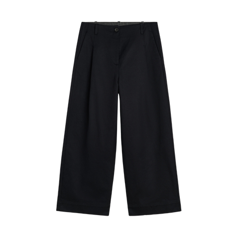 Tidløse bukser, der kombinerer struktur og komfort. Fremstillet i kraftig bomuldstwill, som giver et flot, skulpturelt fald. Den afslappede pasform med mellemhøj talje, vide ben og dybe læg gør dem både behagelige og stilfulde. Skrålommer, en paspoleret baglomme og en dekorativ denimdetalje fuldender looket.