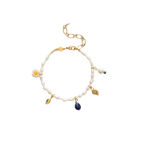 Armbåndet er fremstillet i messing med 18 karat guldbelægning og en beskyttende e-coating, der modvirker anløbning. Det er detaljeret med glasperler, lapis lazuli, malakit, imiteret opal i cabochon-form samt dyrkede ferskvandsperler, som tilsammen giver et rigt og karakterfuldt udtryk. Armbåndet kan justeres fra 16,5 til 21 cm og afsluttes med en hummerlås samt en fin detalje i form af en dyrket ferskvandsperle.