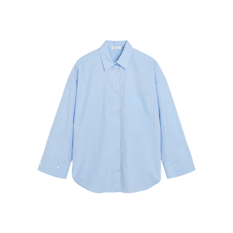 Simple and timeless shirt with a loose fit that gives a relaxed look. The shirt is designed with a classic collar, a practical chest pocket and wide cuffs with a small button closure. On the sleeve is a nice logo detail. The shirt is made of a light and airy material that feels comfortable against the skin and falls nicely. Style it with the striped trousers from By Malene Birger for a set.