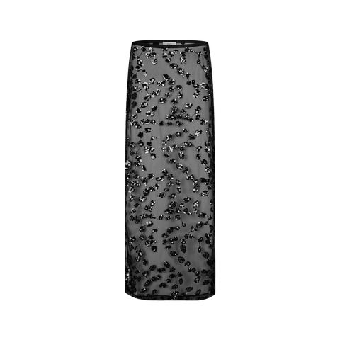 Pailletmesh maxinederdel. Gennemsigtig elastisk mesh med pailletter overalt. Dyb slidse i den ene side. Normal pasform med lige silhuet.