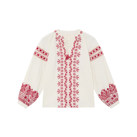 Langærmet bluse i blød bomuld med rødt valmuebroderi. Rund halsudskæring med V-åbning og manchetter med knap. Afslappet og ubesværet silhuet. Inspireret af traditionelle ukrainske bluser.