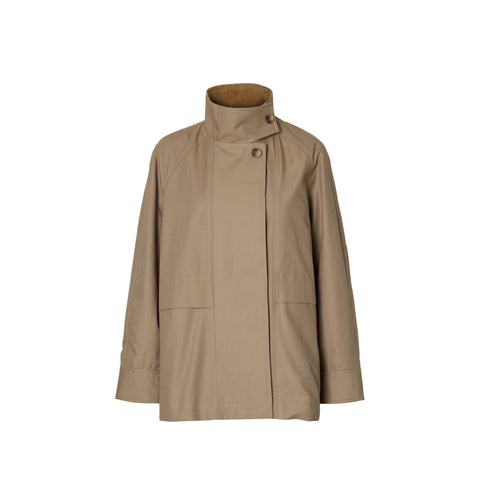 This jacket has a high neck and long raglan sleeves with button cuffs, which give an elegant and stylish look. The hidden button closure highlights the clean design, while the practical front pockets add functionality. The jacket is lined with soft cotton, ensuring a comfortable and breathable feel all day long. With a focus on sustainability, it is made with at least 50% organic cotton, making it an environmentally friendly choice. The jacket is perfect for formal occasions in the spring season and combines quality with a classic, timeless look.