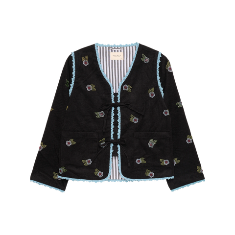 Tahlia Jacket is a short, feminine jacket made from surplus cotton baby corduroy. The jacket has straight sleeves and a shaped V-neck with two sets of ties at the front. It is lined with striped surplus cotton and decorated with delicate lace ribbons along the edges and a sweet flower motif made of beads.