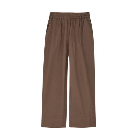 Jasmine Pants are a pair of wide trousers with a comfortable fit and a slightly cropped leg length made of 100% organic cotton. The trousers have an elastic waist and side pockets.